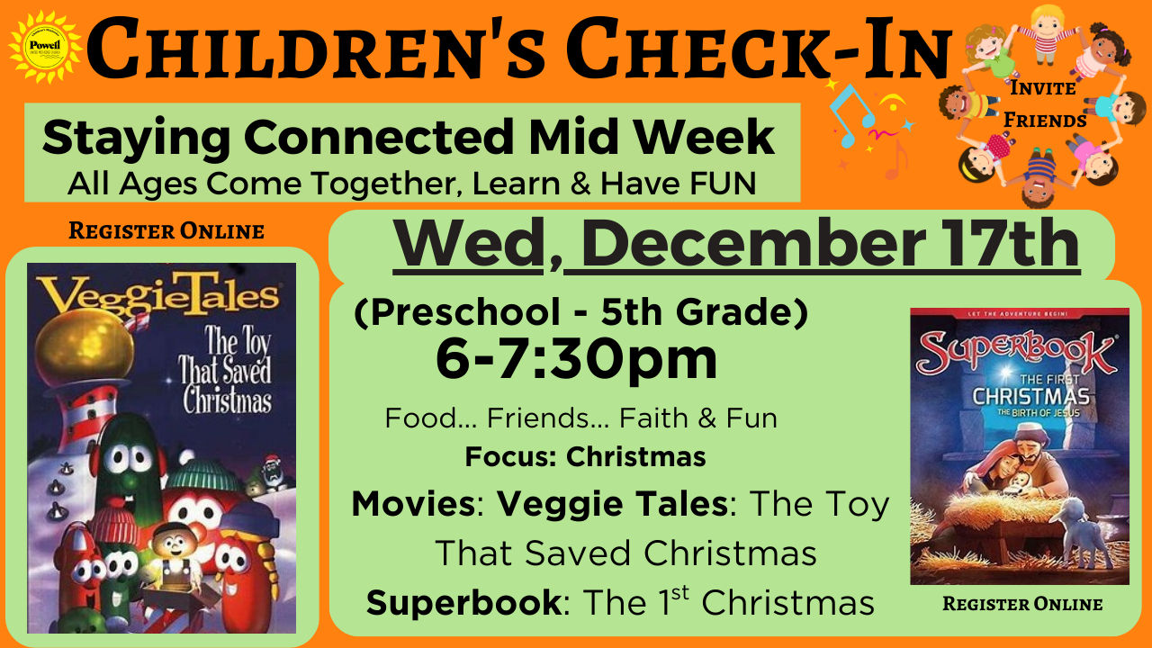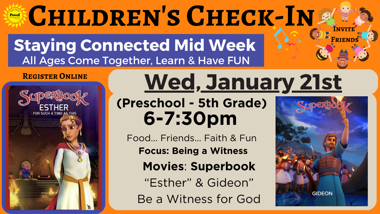 Let’s Stay Connected! All children preschool – 5th grade are invited to attend. We will eat dinner together (Pizza), watch Christian music videos, color, hear a book about the Bible and our monthly focus topic, watch a video, pray, dance and talk about God in our lives! This is a time of fellowship and fun to grow in our faith together. We will meet in the Children’s Worship Room.