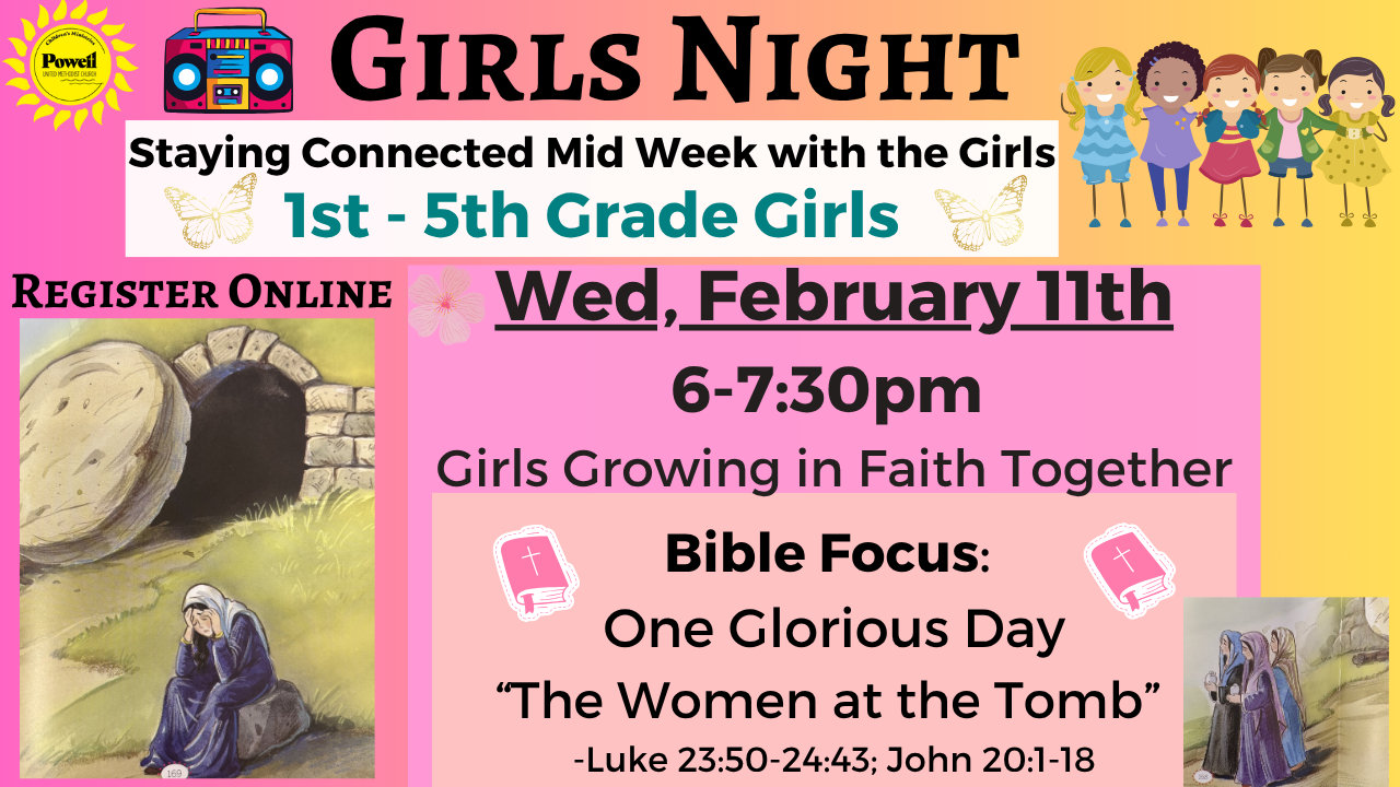 Let’s Stay Connected and have Girl Talk, Bible, Friends, Food, & Faith! All girls in 1st – 5th grade are invited to attend! Being a girl has lots of challenges. This program is designed for us to come together, share our lives, thoughts & struggles. We will chat about life, color, do crafts, activities, devotionals and learn about different girls in the Bible! What was God teaching them and what is God teaching us today! It is great to all gather together, but sometimes we just want to be with the girls, come to Girls Night! We will meet in the Children’s Worship Room.