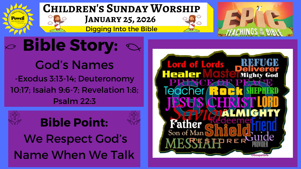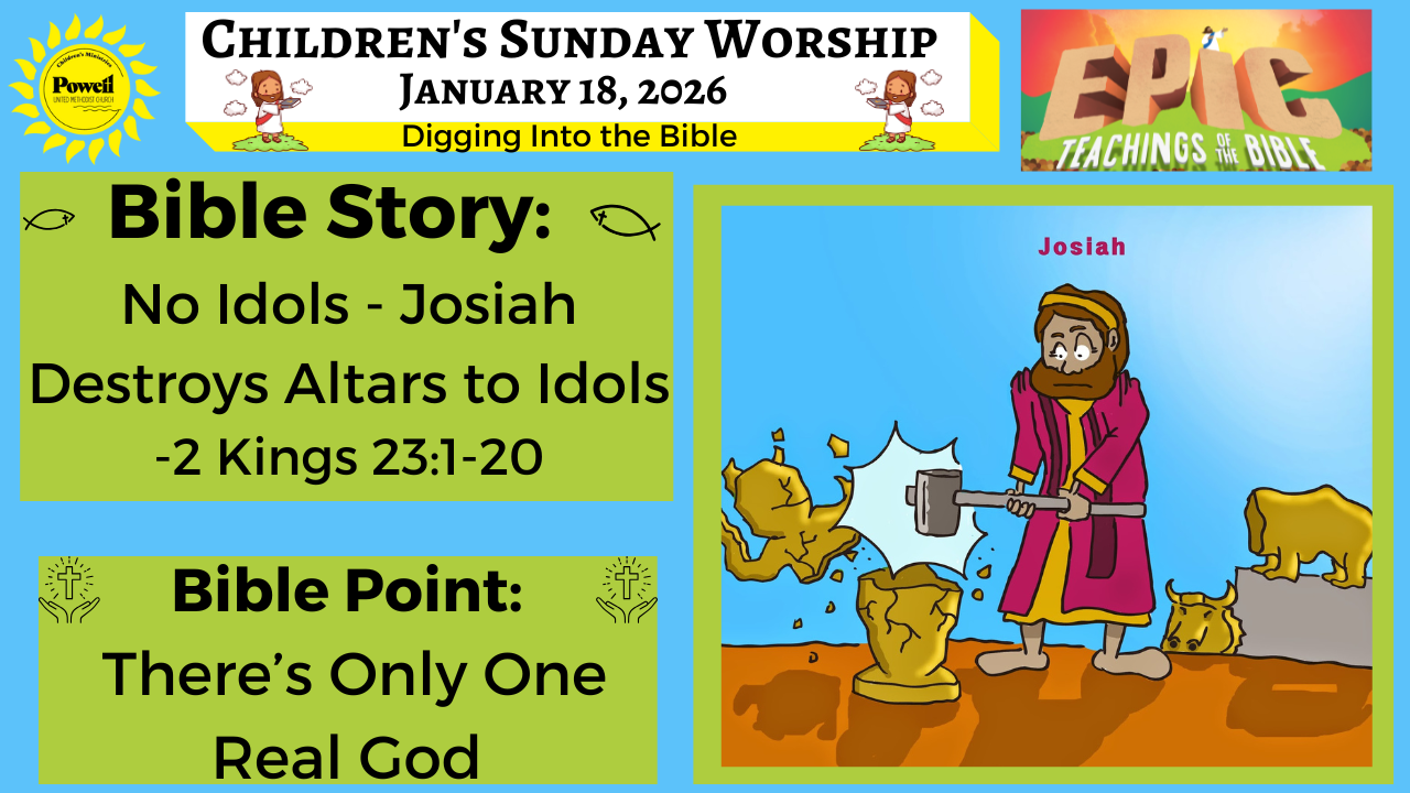 Powell UMC bases the Sunday school lessons on “DIG IN” by Group Publishing. This year we will be opening the Bible and DIGGING INTO The Life of Jesus! We will lead the kiddos in Jesus’ footsteps from birth to resurrection to ascension. Kids do not just learn about the historical Jesus; they get to know him personally. Through the Life of Jesus all will discover Jesus is a real person – a real friend – who makes a difference in our lives today! The weekly message around the verses and focus will be written and given by Ms. Rebecca every week!